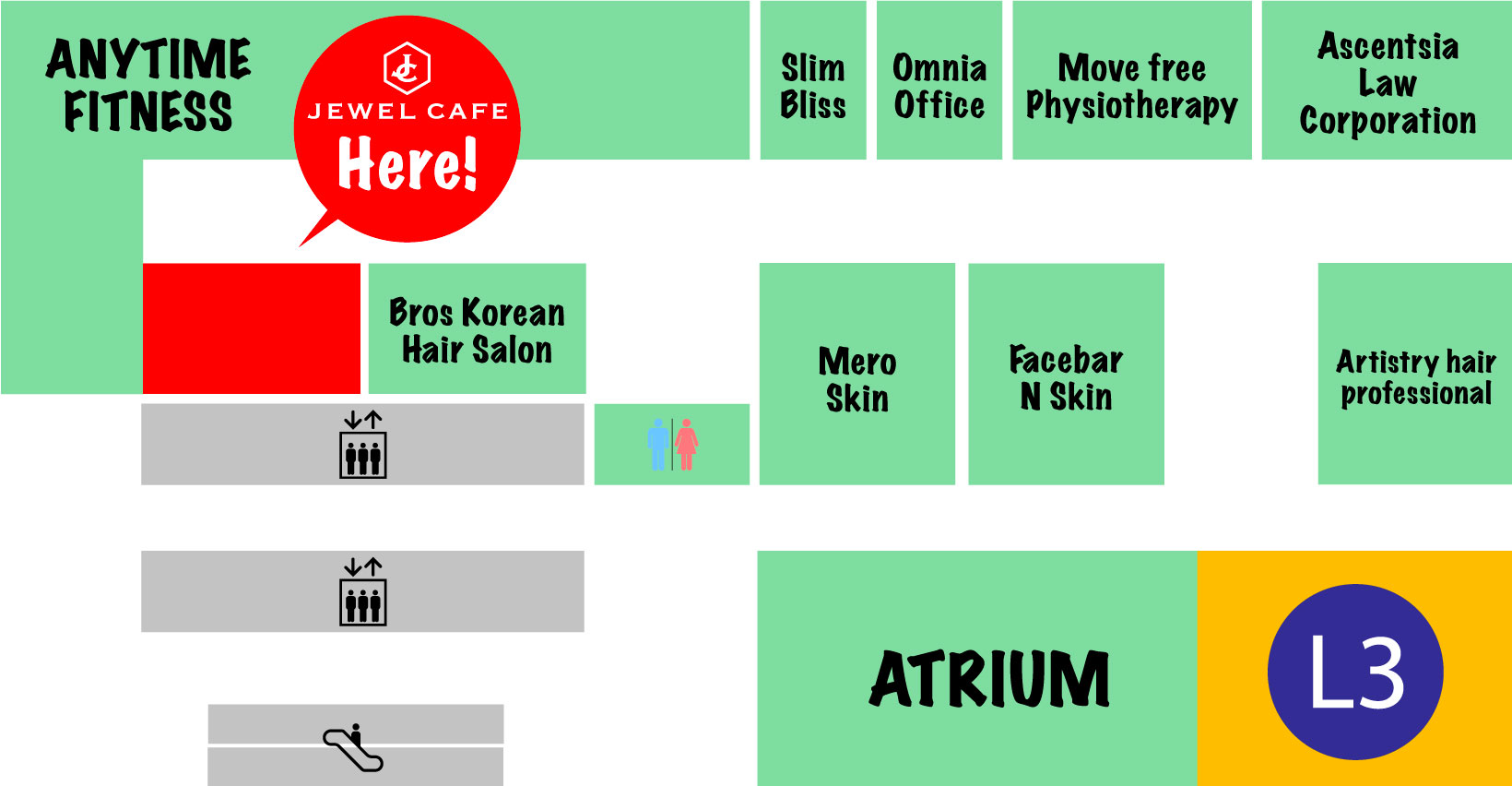• 5. Jewel Cafe (#03-38) is on your left hand in front of the Anytime Fitness.